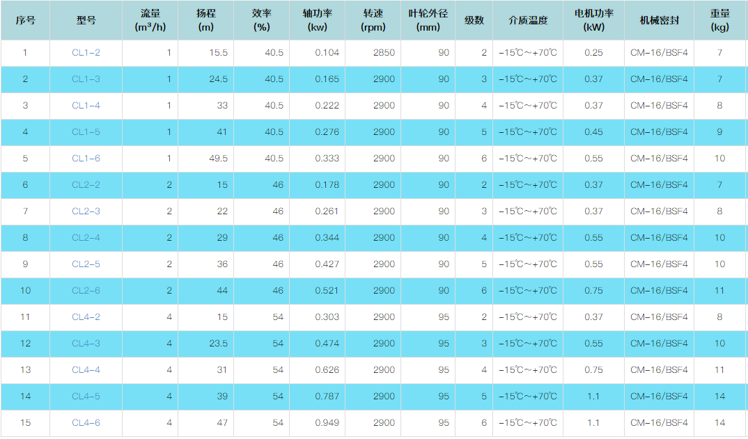 CL系列为冷水机组专用泵,为非自吸式轻型卧式多级离心泵,主要针对进水不足工况,有效解决因进水不足而造成的机械密封干摩失效的故障,配加长轴电机,紧凑式结构使泵尺寸很小,轴向入口和径向出口,产品具有节能、低噪、环保,外形美观、重量轻、安装维护方便、可靠性高等特点。